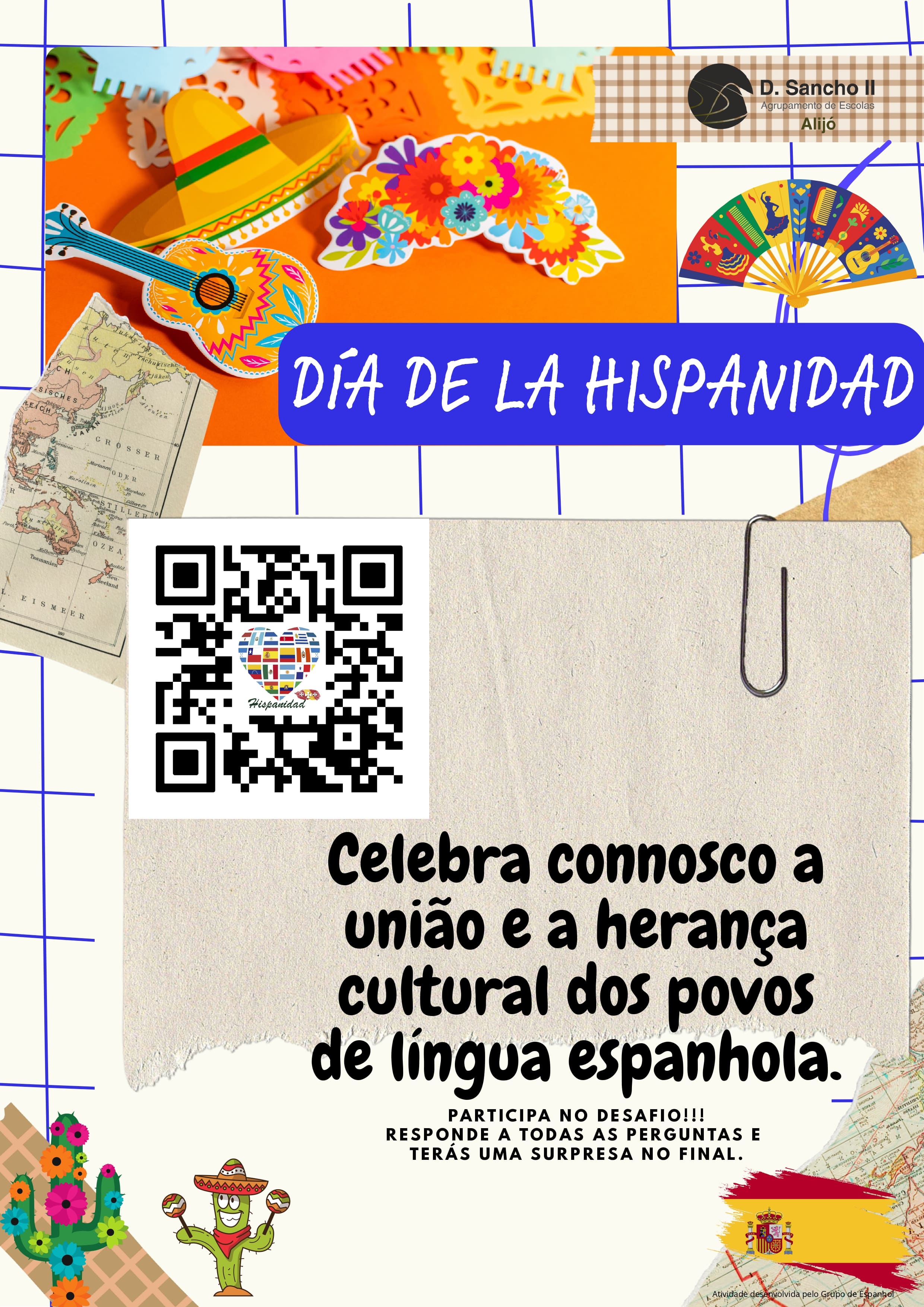 A atividade proposta aos alunos teve como objetivo promover o conhecimento da cultura hispânica de forma dinâmica e envolvente. Através da leitura de QR codes espalhados pela escola, os alunos eram desafiados a responder a perguntas relacionadas com diferentes temas. Cada resposta correta permitia avançar para a pista seguinte, culminando no desafio final.
