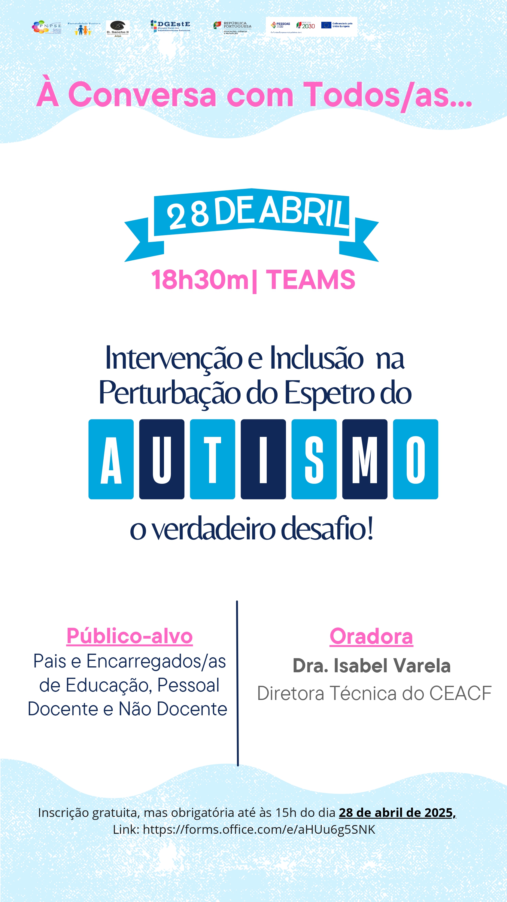 INFORMA-SE A COMUNIDADE ESCOLAR INTERESSADA NA IV "À CONVERSA COM TODOS/AS" QUE EM VIRTUDE DO APAGÃO ELÉTRICO DO DIA 28 DE ABRIL, A REFERIDA ATIVIDADE DECORRERÁ NO PRÓXIMO DIA 05 DE MAIO ÀS 18.30H. Anterior Seguinte