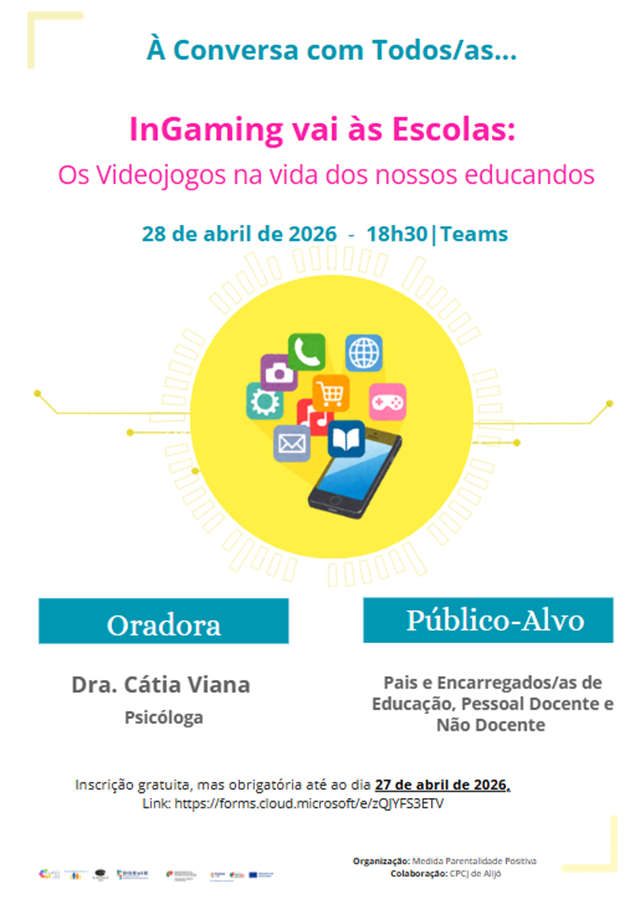A medida Parentalidade Positiva deste Agrupamento, em colaboração com a CPCJ de Alijó, irá promover a VII ação “À conversa com todos/as… subordinada ao tema "InGaming vai às Escolas: Os Videojogos na vida dos nossos educandos", a realizar-se no dia 28 de abril de 2026, às 18h30, através da plataforma Teams.